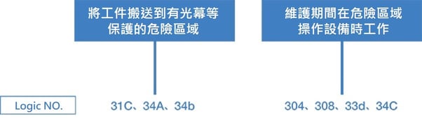 31C、34A、34b 將工件搬運到有光幕等保護的危險區域內時的暫時無效化功能控制邏輯。